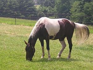 The horse pictured above is my horse, A Patchy Star. He is a registered Spotted Mountain Horse. A Patchy is a tri-colored Tobiano and very fine! A relatively new breed, these horses are colorful, versatile, good natured and best of all, have a extremely comfortable gait for riding. The required "saddle gait" of the Spotted Saddle Horse includes the stepping pace, fox-trot, single-foot, flat walk, running walk, pace, rack or combination of all gaits. This breed also canters. A Patchy is five gaited, although I do not let him trot unless we are jumping. I take the jumps from a trot or a canter.